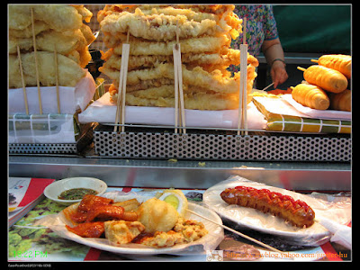沒騎到車沒關係,在地鐵玉水站(Oksu, 標號335)旁有三家攤販,圍了一些學生族及上班族,原來都是賣「炸物」;Jupiter隨便點了幾樣有天婦羅、炸蛋,還不知道炸什麼的,然後灑上紅通通的辣醤,再佩上芝麻醬油,味道還不錯~這樣大約60元台幣。桌面上還放有一瓶有冰塊的礦泉水,是給客人喝的,這點對Jupiter很重要,因為Jupiter並不耐辣 :D